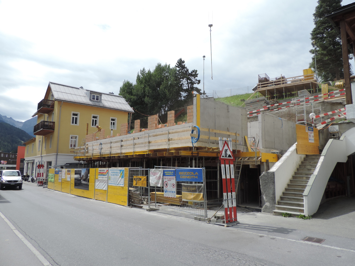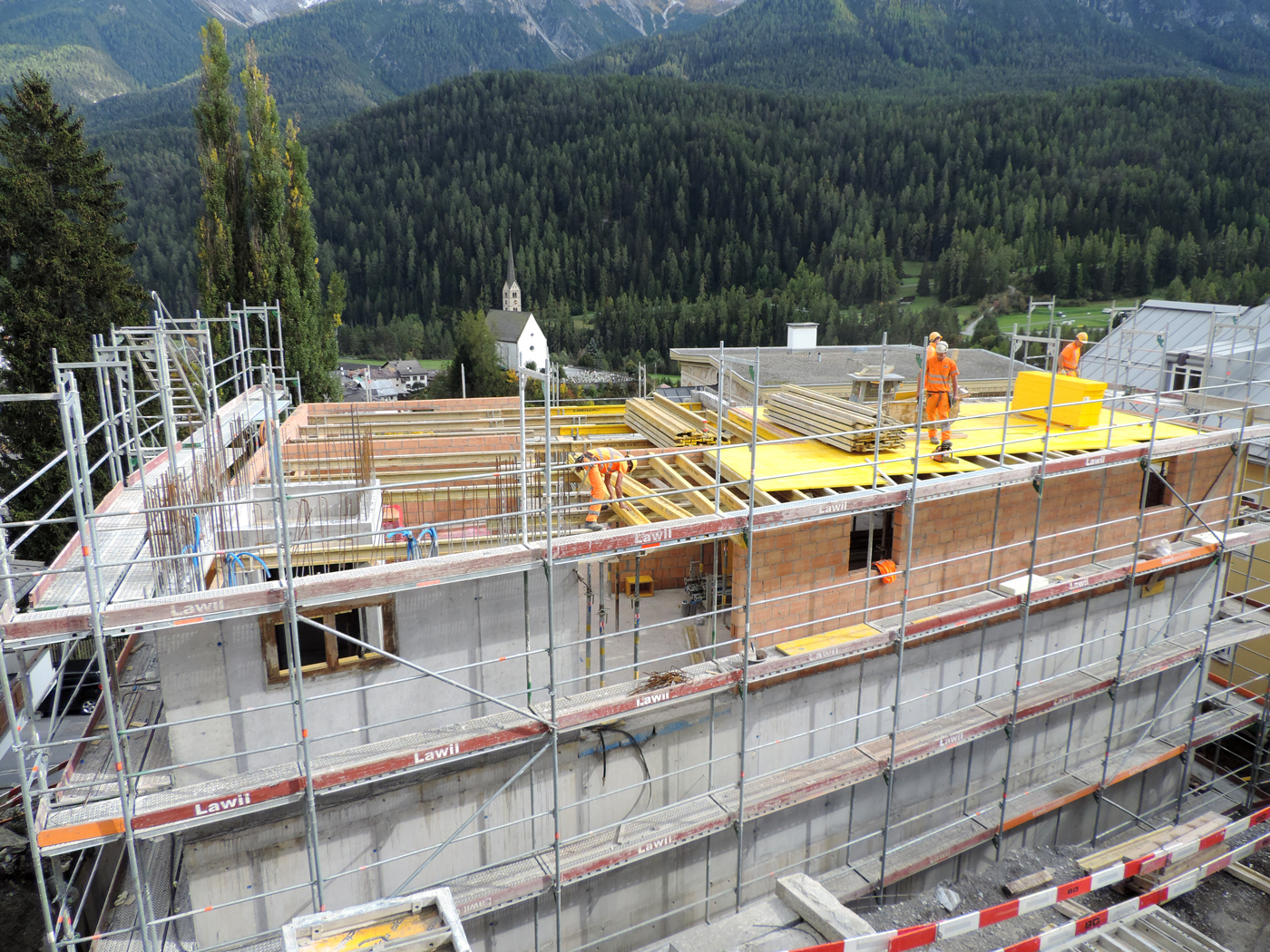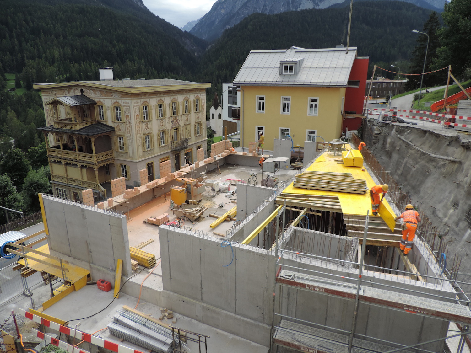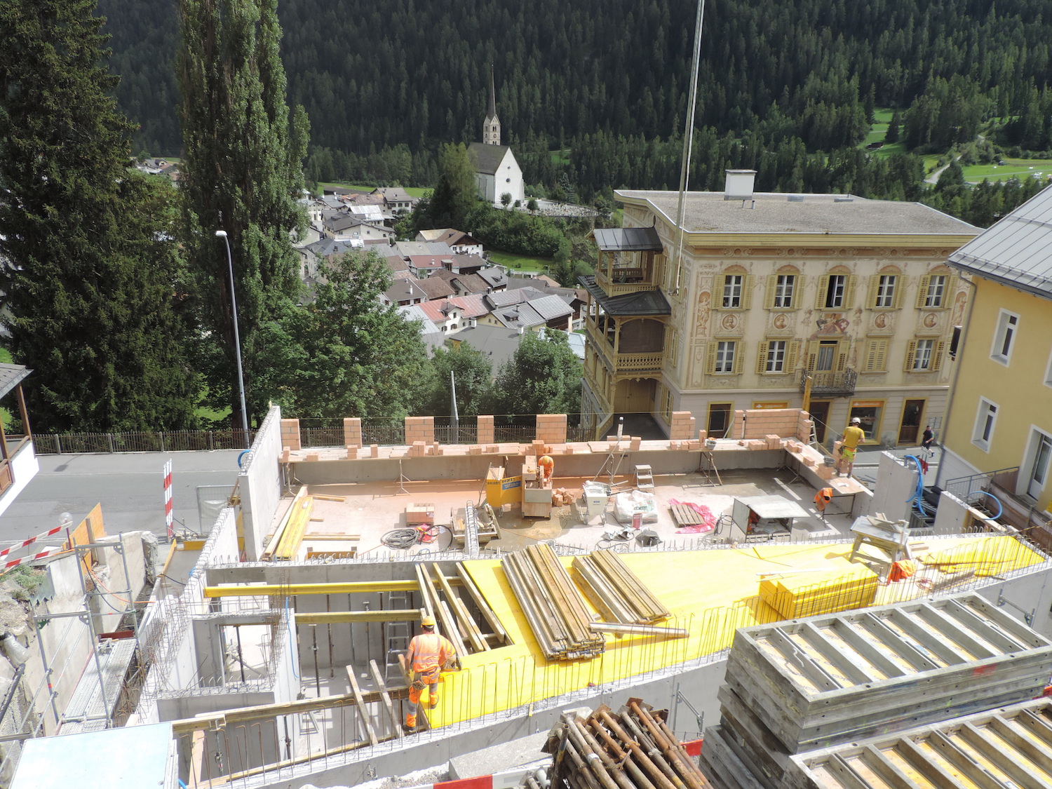 Nach dem Rückbau des alten Gebäudes in den Monaten April und Mai 2017, wird nun am Rohbau gearbeitet. Bis Ende August 2017 wird die Decke über dem 1. Obergeschoss betoniert sein. Gemäss Bauprogramm wurde die Dachkonstruktion Mitte Oktober 2017 aufgerichtet.